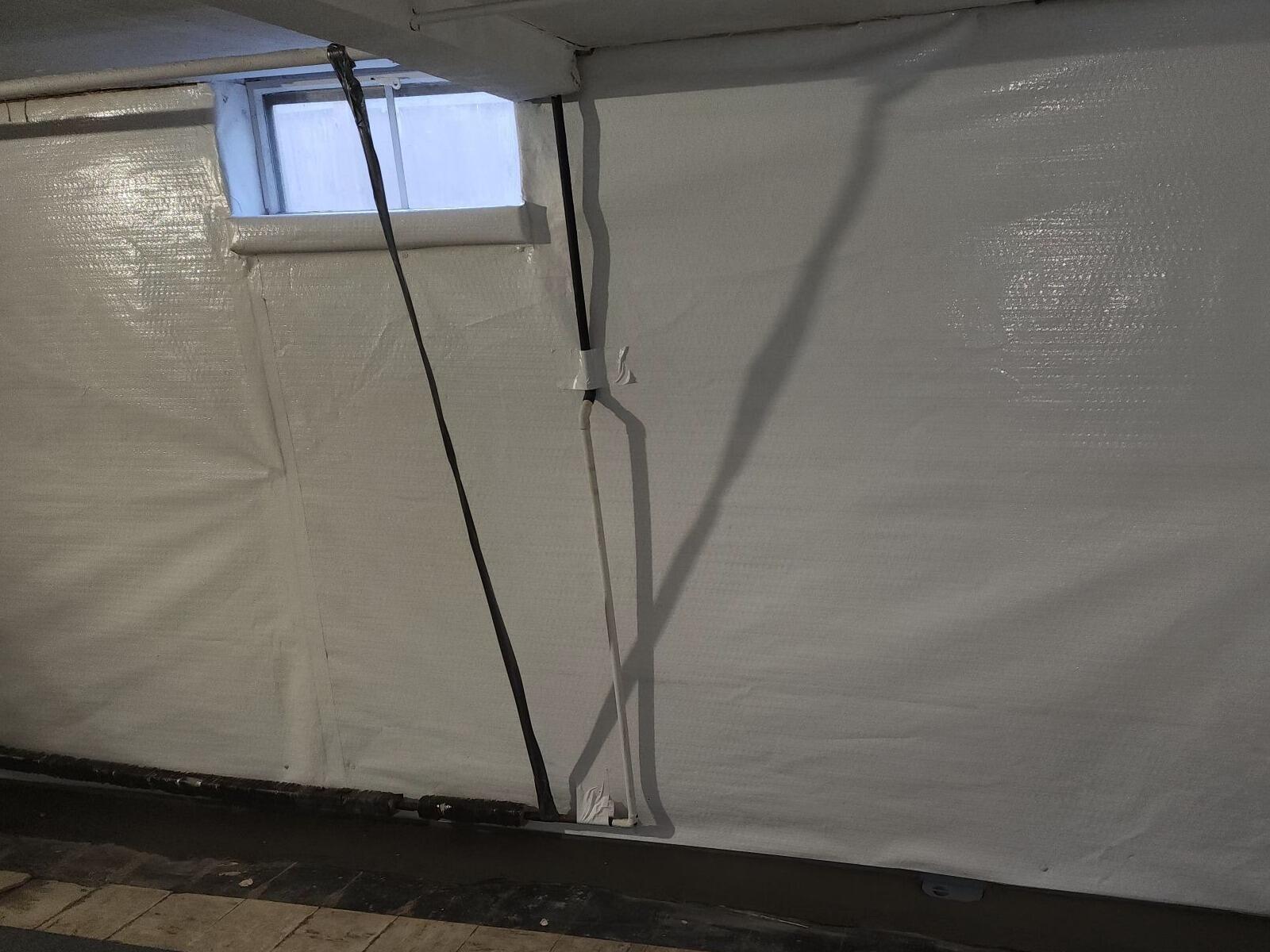 For this basement waterproofing job, we installed a Cleanspace Vapor Barrier and WaterGuard along the leaking wall, and tied this into his current sump pump.