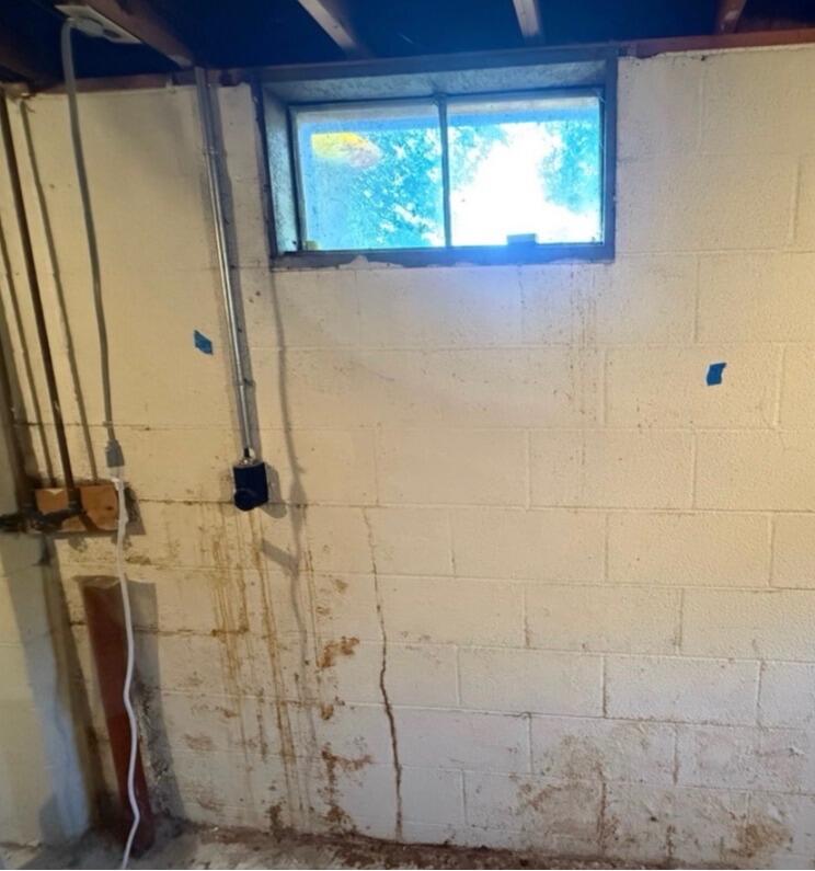 This basement wall has developed a large horizontal crack—a common sign of bowing due to external soil pressure. As the foundation walls weaken, they start to push inward, compromising the home's structural integrity. Without reinforcement, the wall could continue to bow and eventually fail. Our team installed static beams to stabilize the wall and prevent further movement, ensuring the long-term safety of this home.